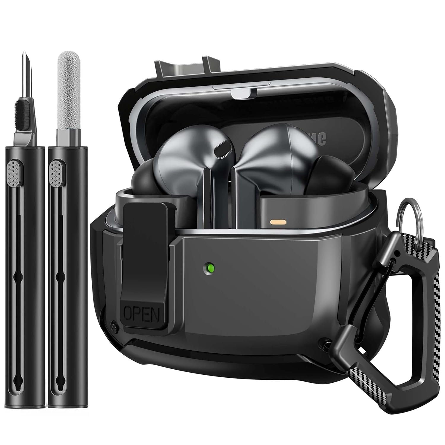 Protect your Samsung Galaxy Buds 3 or Galaxy Buds 3 Pro (2024) with the Sounce Case Cover, designed to offer full-body shockproof protection. Made from durable TPU and PC materials with a sleek carbon fiber texture, this rugged case is built to withstand drops, bumps, and scratches, keeping your earbuds safe in any situation. The innovative hidden secure lock ensures your case remains securely closed, preventing accidental openings while providing easy access with a simple press of the “OPEN” button. Lightweight and portable, the case includes a carabiner for convenient attachment to bags, backpacks, or keychains, making it perfect for on-the-go use. The package also comes with a versatile 4-in-1 cleaning pen, designed with a high-density flocked tip, pen point, and charging compartment cleaner to keep your earbuds free from dirt and debris, ensuring optimal performance and longevity.