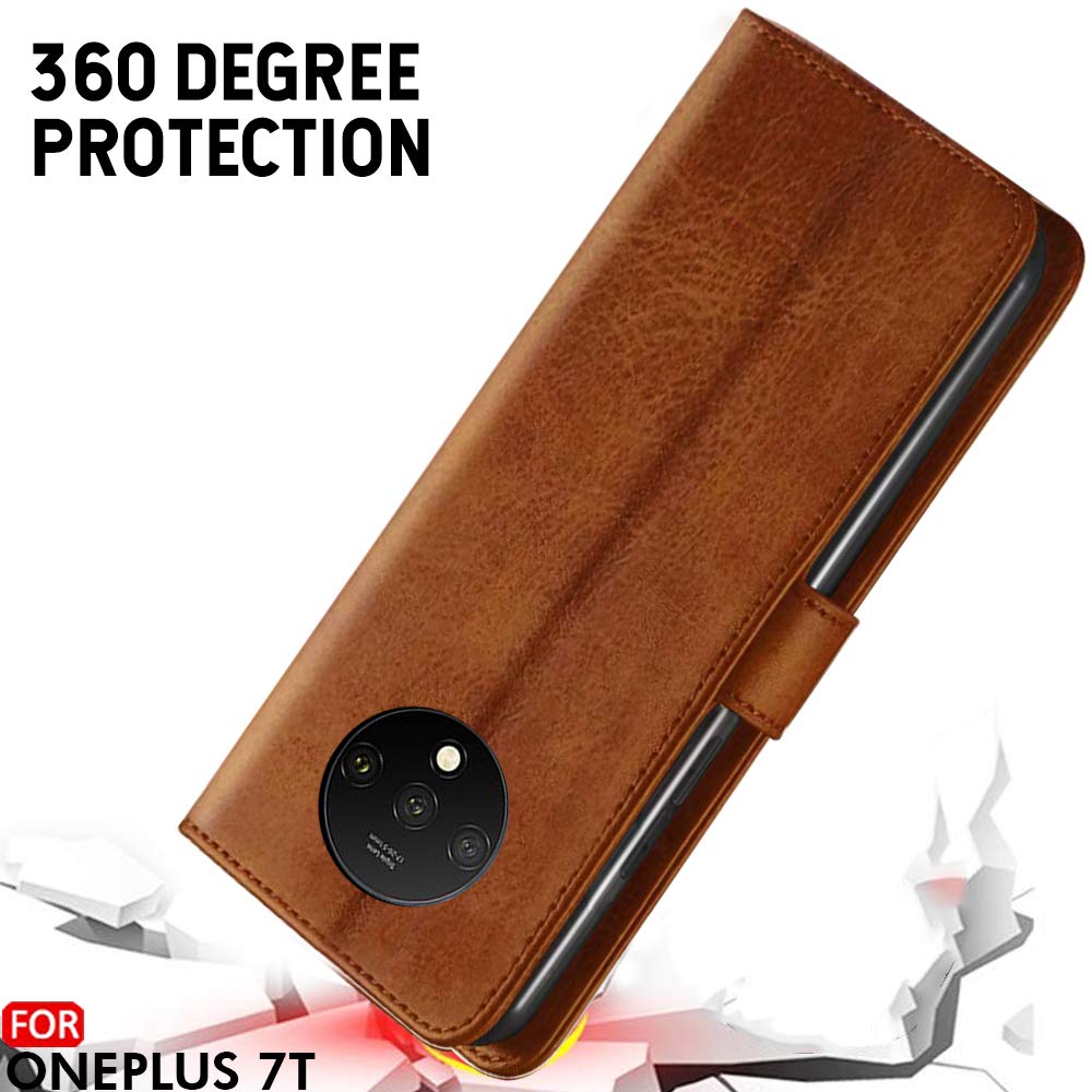 TheGiftKart Genuine Leather Finish Flip Cover for OnePlus 7T | Inside Pockets & Inbuilt Stand | Wallet Style Back Case | Designer Button Magnet Closure (Brown)